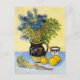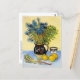 Eine schöne Postkarte mit dem postimpressionistischen Gemälde, Still Life Majolica Jug mit Wildblumen (1888), von Vincent van Gogh (1853-1890). Ein Stillleben eines Steinzeugkrug mit blauen Wildblumen und Zitronen vor einem gelben Hintergrund.