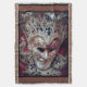 This oil painting by Amanda Diehl features an intricate Venetian mask with elaborate gold and silver details adorning the playful, curly fins of the joker's hat and collar. The mask smiles gaily against a red velvet backdrop.