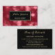 Eine elegante Kosmetologie-Visitenkarte mit glamourösem rotem Buche-Hintergrund. Personalisieren Sie Ihre Arbeit, indem Sie den Namen des beruflichen Makeup-Künstlers oder Kosmetologen in den luxuriösen gerahmten Textbereich in Schwarz und Gold einfügen. Der gesamte Text in dieser Visitenkartenvorlage kann an Ihren Beruf oder das Unternehmen Ihrer Wahl angepasst werden. Flachbild, NICHT metallisch.