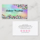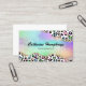 Funky farbenfrohe Visitenkarten mit mehrfarbigem Leopardenhintergrund, einem Regenbogenombre-Zentrum mit goldenen Glitzer-Kanten, Ihrem Namen, Titel, Kontaktdaten und Social Media-Icons. Die Icons können durch Klicken auf Personalisieren entfernt und dann gestochen werden, um weiter anzupassen.