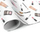 Dieses Packpapier zeigt Desteis illustriertes Muster verschiedener Schminkprodukte. Diese Schminkprodukte beinhalten Paletten, Pulver mit Spiegel, Schminkbürsten, Lippenstift, Lippenglanz, Fundament und Mascara.