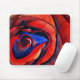 mit originellem Kunstdesign aus Aquarellmalerei von Sacha Grossel mit nahem Fokus, Makro-Stil-rote Rose mit blauen Highlights. Diese traditionelle englische Blume mit Krimsonblättern hat ein helles, intensives Farbdesign, das die Abstraktion der botanischen Form und die Themen der Liebe und Leidenschaft vermittelt.