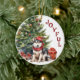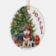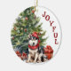An der Vorderseite dieses Holiday-Ornament steht das Bild eines malamischen Hundes, der eine rot-weiße Weihnachtsmannmütze und einen Schal trägt. Der Hund sitzt vor einem geschmückten Holiday-Baum mit bunten Geschenken. Roter Text an der Seite sagt "JOYFUL". Auf der Rückseite steht rot und grün "MERRY CHRISTMAS", und es gibt zusätzliche Textfelder, die Sie anpassen können. Lass es sagen, was du willst!