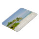 Foto eines entspannenden Strandes in den Malediven mit einem Bungalow, Palmen, warmen Sand und Meereswellen.