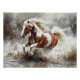Ein dynamisches Gemälde eines durch Wasser laufenden Lackierpferdes, das die kraftvolle Bewegung und natürliche Schönheit dieses spirituellen Tieres in einer wilden Umgebung erfassen soll.