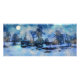 Magische Winternacht mit Sternenhimmel und Vollmond im schneebedeckten Park mit schöner Brücke über einen kleinen Teich, Straßenlicht und mit Schneebäumen bedeckt. Schöne Winternacht