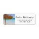 Adressetiketten mit einer schönen Fotografie. Klares blaues Meer mit weißem Sand im flachen Wasser. Ein Strohdachschirm, der in der Brise schaukelt. Ein malerisches, entspannendes Foto.