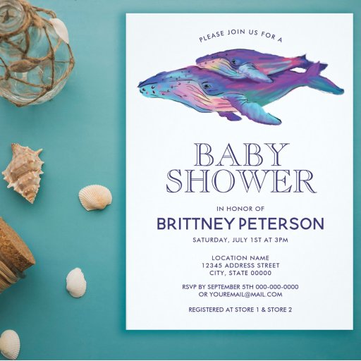 Der mehrfarbige Wal und das Kalb auf dieser Baby-Duschpapiertafel.