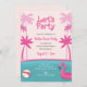 Eine Geburtstagsparty am Pool mit dieser modernen "Malibu Beach Doll" inspirierte Party Einladung für Kinder und Jugendliche. Oben ist "Let's Party" in einem hellrosa Retro-Schriftart angezeigt. Die Einrichtung besteht aus rosa Palmen und einem Swimmingpool mit Flamingo-Floaty und einem Beachball. Die Rückseite der Karte ist rosa, aber Sie können diese in jede beliebige Farbe ändern.