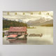 Eine malerische Szene eines Holzboothauses am Maligne Lake, Jasper National Park, Kanada, eingebettet in einer Kulisse von schneebedeckten Bergen und einem üppigen Wald. Das Bootshaus hat ein rotes Dach mit weißem Trimm und die Worte "Malignes Lake Boat House" darauf gemalt. Mehrere rote und weiße Kanus werden an der Holzsteg angedockt, deren Reflexionen auf dem ruhigen Wasser schimmern.