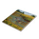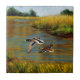Männliche und weibliche Stockenten fliegen über einen goldenen Teich, Wasser-Rippling, um die Farben der Hintergrund Herbstblätterung in der Sonne leuchten. Realistische Kunstwerke, die aus einer Ölmalerei des Künstlers Crista S. Forest entstanden sind.