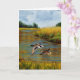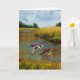Männliche und weibliche Stockenten fliegen über einen goldenen Teich, Wasser-Rippling, um die Farben der Hintergrund Herbstblätterung in der Sonne leuchten. Realistische Kunstwerke, die aus einer Ölmalerei des Künstlers Crista S. Forest entstanden sind.