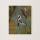 Männliche und weibliche Stockenten fliegen über einen goldenen Teich, Wasser-Rippling, um die Farben der Hintergrund Herbstblätterung in der Sonne leuchten. Realistische Kunstwerke, die aus einer Ölmalerei des Künstlers Crista S. Forest entstanden sind.