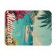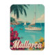 Dieses Vintage Poster spiegelt die ruhige Schönheit der Küste Mallorcas wider, wo sanfte Wellen an goldenen Stränden mit schwebenden Palmen treffen. Elegante Segelboote gleiten über das türkisfarbene Meer unter einem warmen, sonnigen Himmel. Das in sanften Retrofarben und -texturen gestaltete Kunstwerk erinnert an den Charme mediterraner Ferien der Mitte des Jahrhunderts - ideal für Reisende und Fans Vintagen Küstendesigns.