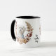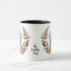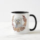 Ein hübscher Herbstkranz in den Farben Zimtbraun, Bräune und Creme umgeben das Aquarellbild eines zauberhaften, weißen Maltesers. Das Bild wird zweimal auf der Tasse gedruckt, wobei der eigene Text dazwischen liegt.