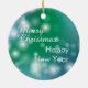 An der Vorderseite dieses Holiday-Ornaments befindet sich ein Aquarellbild eines kleinen weißen maltesischen Hundes, der einen hellen roten Hut des Weihnachtsmanns trägt. Das Bild unterscheidet sich von einem Gradientengrün und Blau, der einen Hintergrund bildet. Die Rückseite des Ornaments hat den gleichen Hintergrund mit dem eigenen weißen Text, der derzeit sagt "Frohe Weihnachten glücklich Neues Jahr". Niedlich für jeden, auch wenn man nicht von einem Malteser "besessen" ist!