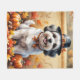 Ein Aquarellbild eines fröhlichen Hundes inmitten eines Haufen lebendiger Herbstlaub, umgeben von winzigen Kürbissen und verstreuten Eichhörnchen. Der Hund trägt einen kleinen Pilgerhut und strahlt vor Freude aus, um den Geist des Erntedanks zu erfassen. Im Hintergrund sorgen weiche Erntefelder und goldfarbene Bäume für eine friedliche Landschaft. Die sanfte Struktur und die warmen, gedämpften Herbsttöne verleihen der Szene ein gemütliches, nostalgisches Gefühl, das perfekt ist, um die Schönheit der Saison zu feiern.