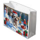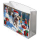Malti Tzu läuft im Schnee mit Weihnachtshut Große Geschenktüte