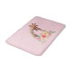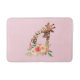 Eine Badematte mit einem niedlichen zeichn in Aquarellen einer Mama- und Babygiraffe. Die Muttergiraffe ruht sich auf der Giraffe des Babys, liebend und liebenswert. Hübscher rosa, gelber, grüner Aquarellbouquet unter diesem Lieblingspaar. Heller rosa Hintergrund.