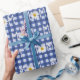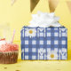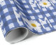 Mama Text mit weißer Blume und Blütenblättern auf weißem und blauem Gingham-Muster.