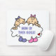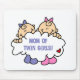 Unsere Mama der Doppelmädchen-T - Shirts, der Tassen, der Knöpfe, der Magneten, der Karten, der Taschentaschen und anderer Mama der Doppelmädcheneinzelteile kennzeichnet zwei entzückende Babys in den Rosa- und Lavendellagerschwellen, die eine Wolke halten, die "Mama der Doppelmädchen!" liest.