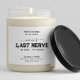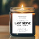 "Mama Last Nerve"-Label für Ihr Kerzengeschäft, um ein lustiges und niedliches Mama-Geschenk zu kreieren. Du kannst Mama auch mit beliebigem Namen bearbeiten. Geben Sie Ihren Firmennamen, den Kerzenduft sowie weitere Informationen über Ihre Wahl Ihrer Kerze oder Ihres Unternehmens ein.