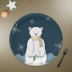Adorable Teller mit einer Illustration eines kleinen Eisbären mit seiner schützenden Mutter auf dunkelblauem Hintergrund mit weißen Schneeflocken. Ideal für Babyduschen, Eisbärenliebhaber und Party-Feiern mit Kindern. Das Bild sieht so aus, als wäre es in drei Dimensionen, aber es ist nur ein Druck. Illustriert und entworfen von Patricia Alvarez.
