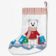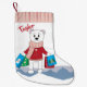 Ein weißes WeihnachtsStrumpf mit einer rosa und roten gestreiften Imitatgrenze und ein polarer Bär Mutter, der 4 Einkaufstaschen trägt. Fertigen Sie es mit einem Namen besonders an.