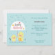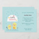 UnisexBabyparty-Einladung. Niedlich und Spaß. Eigenschaften Mamma und Babyküken, das einen Regenschirm unter einem leichten Regen hält. Weiche Pastellfarben passend für irgendein Geschlecht. Moder und Bonbon.