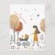 Das ist eine sehr gemütliche und warme Tageskarte für die Mutter mit einer Illustration, wie eine Mutter ihr Kind zum Spaziergang im Park mitnimmt. Es gibt niedliche Herzen, irdisch gefärbte Bäume und Blume, und das Kind ist im Strolley.
