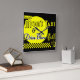 Eine Retro-Küchenwanduhr mit der Aufschrift "Mamas Taxi und Drive-thru Grill" in schwarz-gelb Farbe.