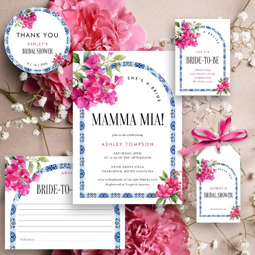 Diese Kollektion besticht durch einen atemberaubend blauen, italienischen Fliesenbogen, der von mediterranem Charme inspiriert ist und von üppig rosa Aquarellfloralen umgeben ist, um eine lebendige, romantische Touch zu erleben. Die spielerische "Mamma Mia!"-Slogline verleiht dem Brautparty ein fröhliches, feierliches Ambiente, das perfekt für ein stilvolles und unvergessliches Ambiente sorgt. Dieses Design verbindet klassische Eleganz mit skurrilem Flair, ideal für ein Sommerfest oder ein italienisches Fest. Bitte kontaktieren Sie uns für Design-Hilfe via Zazzle Chat oder per E-Mail stephanyanddany@gmail.com. Wir werden innerhalb von 12 Stunden antworten.