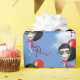Das Gesicht des Menschen mit einer Sonnenbrille und Haar auf dem Geburtstagsballon auf einem Himmelshintergrund.