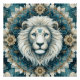 Dies ist ein atemberaubendes Kunstwerk, das in der Mitte ein stilisiertes Löwengesicht zeigt. Das Löwenmane bildet ein mandalähnisches Design, mit fließenden weißen und grauen Linien, die ein Gefühl von Bewegung und Textur erzeugen. Um das Gesicht herum sind komplizierte Muster, die nach außen ablagern, inklusive floraler und geometrischer Formen in Blau, aquamarin und Beige. Diese Elemente tragen zu einem Gefühl der Tiefe und Symmetrie bei. Der Hintergrund ist tief aquamarin, mit winzigen sternähnlichen Flecken übersät und verleiht dem Stück ein himmlisches und mystisches Flair. Das Kunstwerk verbindet natürliche und fantastische Themen nahtlos und schafft eine visuell faszinierende Komposition.