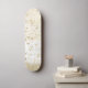Eine verzierte Lotus Mandala mit goldenem Gold auf weißem Hintergrund mit goldfarbenen Sternen unten und am Boden des Skateboards ist eine glänzende Goldgrube für extra Glanz. Mystische, skurrile Vibes.