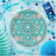 Zwölf Punkte Mandala Muster in Türkis, Blau, Weiß und Grautönen auf einem blassgrauen, silbergrauen Hintergrund
