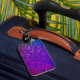 Dieses Design zeichnet sich durch ein lebendiges, symmetrisches Mandala-Muster aus, dessen blattähnliche Formen von der Mitte ausstrahlen. Kühne Linien und komplexe Details schaffen ein Gefühl von Bewegung und Energie. Der Farbverlauf ändert sich von tiefen Pinseln und Purpuren zu warmen Orangen und cooler Blues, alles Set vor einem reichen lila Hintergrund. Die Gesamtwirkung ist dynamisch, auffällig und voller künstlerischen Flairs.