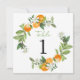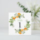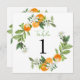 Mandarin Orange Watercolor Wedding Tischnummer Sign - Teil einer modernen, eleganten Hochzeitskollektion für diejenigen, die ihren Hauptpresse gefunden haben. Mandarin Zitrusfrüchte, botanische Orangenfrüchte, grüne Blätter und Blüten mit einem entsprechenden Muster auf der Rückseite. Sie können die Farbe des Schriftartes und des Schriftartes ändern. Diese Kollektion hat passende Einladungen, speichern Sie die Daten, rsvps, Menüs, Umschläge und Labels. Ideal für Hochzeiten im Frühling oder Sommer.