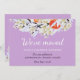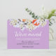 Elegante und schicke neue Zuhause-bewegende Ankündigungskarte mit wunderschönen blühenden Mandarinen und Text "We have move". Blütenbotanische Karte mit zarten Frühlingsfrühlingserzeugnissen, Blume und Zitrusfrüchten. Orange, Pastellfarben und Lila. Geben Sie Ihren Namen und Ihre Adresse ein.