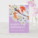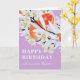 Elegante und schicke Geburtstagskarte mit wunderschönen blühenden Zweigen der Mandarine. Blütenbotanische Karte mit zarten Frühlingsfrühlingserzeugnissen, Blume und Zitrusfrüchten. Orange, Pastellfarben und Lila. Fügen Sie Ihren Text hinzu.