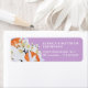 Elegantes und schicke Rücksendetikett mit schönem Kranz in der Mandarine. Blütenbotanische Illustration mit federempfindlichen Blume, blühenden Ästen und Zitrusfrüchten. Orange, Pastellfarben und Lila. Personalisieren Sie Ihre Namen und Adresse.