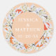 Eleganter und schicker Hochzeitsaufkleber mit schönem Kranz aus der Mandarine. Blütenbotanische Illustration mit federempfindlichen Blume, blühenden Ästen und Zitrusfrüchten. Pastellpfirsich und orangefarbene Farben. Personalisieren Sie mit Ihren Namen und Datum.