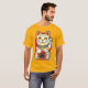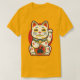 Diese lebendige Abbildung zeigt ein traditionelles japanisches Maneki Neko, oder "Lucky Cat", dargestellt in einem charmanten und skurrilen Stil. Die Katze wird aufrecht sitzend gezeigt und ihre links Pfote in einer einladenden Geste gehoben, von der angenommen wird, dass sie Glück und Glück bringt. Die Katze hat einen zauberhaften und fröhlichen Ausdruck, mit ihren weiten Augen und dem Mund gekrümmt zu einem sanften Lächeln. Das Maneki Neko ist vorwiegend weiß mit gelben und roten Farbtupfern gestaltet, was dem Design eine lebhafte und farbenfrohe Touch verleiht. Es trägt einen grünen Kragen, der mit einer goldenen Glocke geschmückt ist und Wohlstand und Wohlstand symbolisiert. Die Katze hat eine große, rote Münze mit schwarzen Pfotendrucken, die ihre Rolle als Glücksbringer und Glücksbringer noch weiter unterstreichen. Der Hintergrund weist einen kühlen roten Kreis auf, der das helle und fröhliche Aussehen der Katze steigert. Das Gesamtbild ist Retro, leicht bedrückt, und verleiht ihm ein nostalgisches und zeitloses Gefühl.
