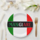 Diese Party-Platte ist mit dem Begriff "mangiare" versehen, der in der Mitte gedruckt wurde. Mangiare ist die italienische Übersetzung für "essen" und sie ist in den Farben der italienischen Flagge gedruckt. Die ersten drei Buchstaben sind grün, die zweiten sind weiß, und die letzten drei sind rot. Es ist über die italienische Flagge gedruckt.