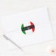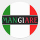 Auf diesem individuellen Aufkleber ist der Begriff "mangiare" in der Mitte aufgedruckt. Mangiare ist die italienische Übersetzung für "essen" und sie ist in den Farben der italienischen Flagge gedruckt. Die ersten drei Buchstaben sind grün, die zweiten sind weiß, und die letzten drei sind rot. Es ist über die italienische Flagge gedruckt.