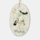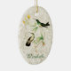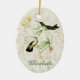 Auf einer tropischen Pflanze mit gelben Blumen stehen zwei zarte, grüne Kolibris auf einem hellen, goldgelben Marmorboden. Personalisierungsoptionen auf Vorder- und Rückseite, oder entfernen Sie Text für eine elegante Natur- Zusatz zu jedem Weihnachtsbaum. Perfektes jedem Anlass-Geschenk für Liebhaber von Kolibris.