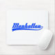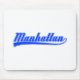 Manhattan, New York City, geschrieben mit einem Swash (Schwanz). Schriftart in Weiß und Blau. Originelles Textdesign.