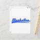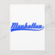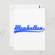 Manhattan, New York City, geschrieben mit einem Swash (Schwanz). Schriftart in Weiß und Blau. Originelles Textdesign.