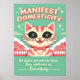 “Manifest Domesticity” is a playful, pastel-toned tribute to the quiet takeover of human civilization by cats. Featuring a wide-eyed, smiling feline with galaxy-swirled pupils, a neat bow tie, and a perfectly manicured suburban backdrop, the design blends cuteness with subtle cosmic humor. The text—“We didn’t domesticate them. They infiltrated us. Beautifully.”—adds wit and charm, turning a familiar truth into a delightful visual statement.