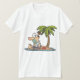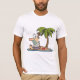 Dieser Entwurf ist ein Mann auf einer verlassenen Insel. Getan in einer Cartoonart sitzt der Mann unter einem Kokosnussbaum. Dieser Mann auf einem verlassenen Inselentwurf schaut auf dem diesem T - Shirt der Männer groß